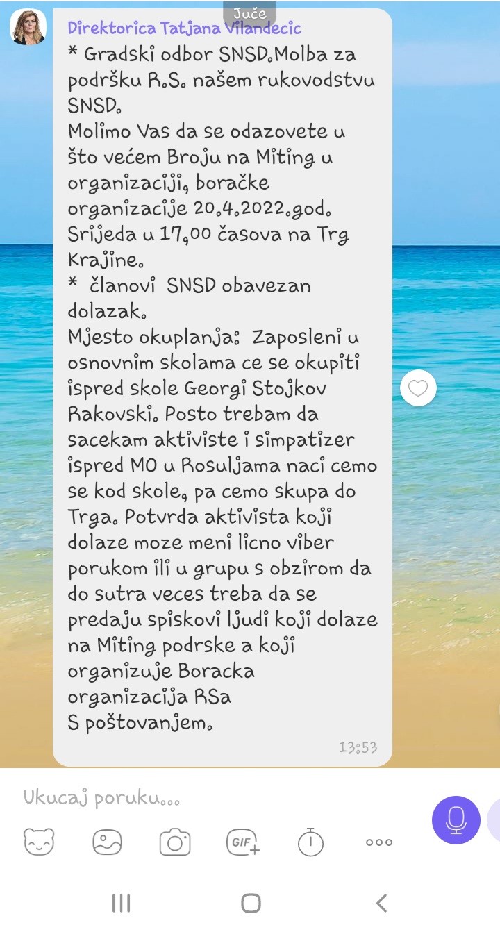 Ovo je poruka koju je kolegama i zaposlenima uputila direktorica osnovne škole "Vuk Stefanović Karadžić" u Banjoj Luci Tatjana Vilendačić. U poruci se navodi da je dolazak za članove SNSD-a obavezan.