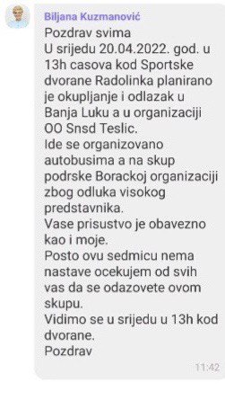 U srijedu, 20. aprila, u 13h kod Sportske dvorane "Radolinka" planirano je okupljanje i odlazak u Banju Luku, a u organizaciji OO SNSD-a Teslić. Ide se organizovano autobusima, a na skup podrške Boračkoj organizaciji zbog odluka visokog predstavnika. Vaše prisustvo je obavezno, kao i moje.