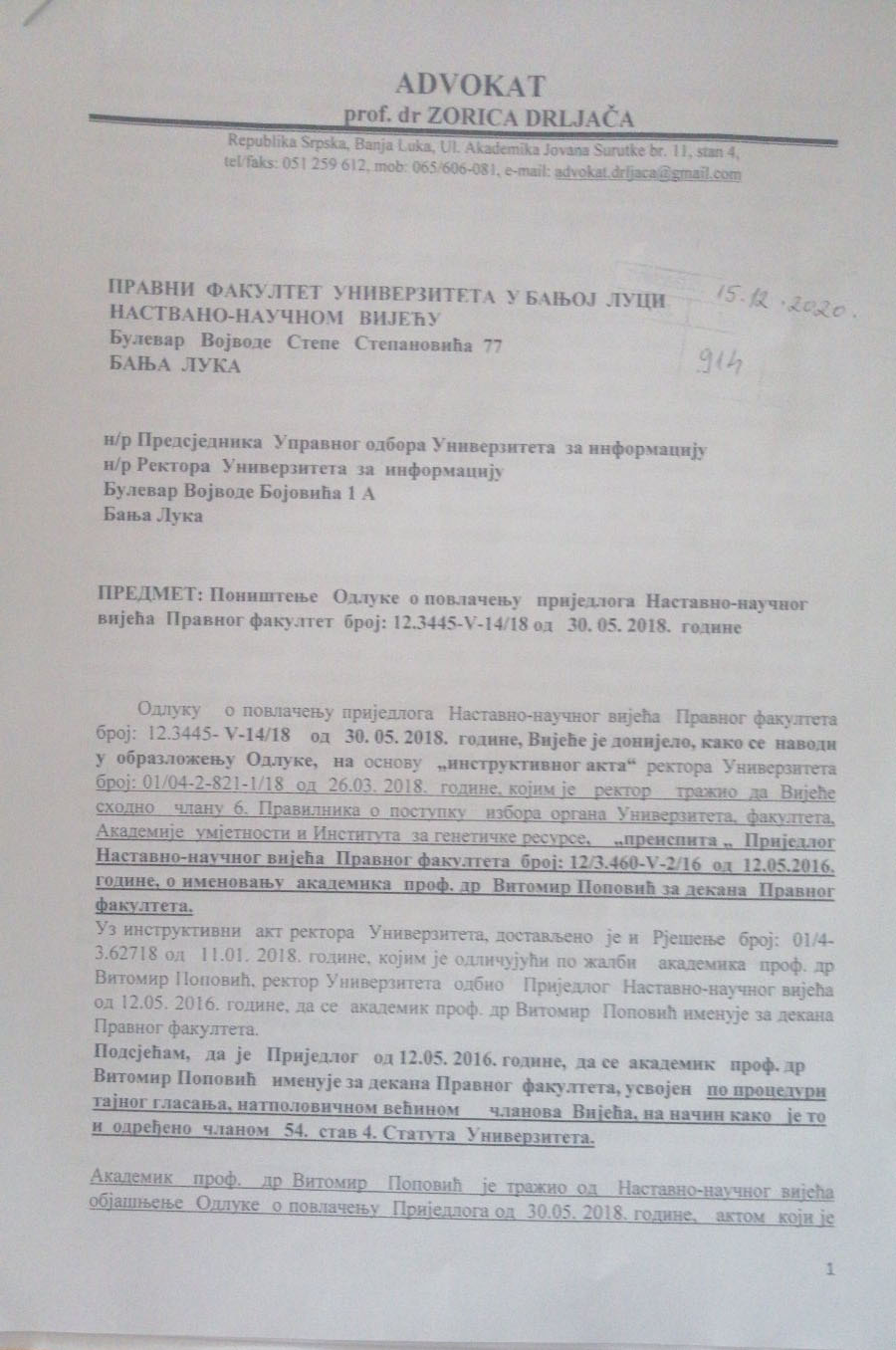 Uz „instruktivni akt“ Vijeću je dostavljeno i rješenje rektora od 11. januara 2018. godine kojim je rektor, odlučujući po Popovićevoj žalbi, odbio prijedlog NNV da se Popović imenuje za dekana. Na ovo rješenje je uložena žalba Upravnom odboru Univerziteta u Banjoj Luci koji je 23. februara 2018. godine odbio žalbu kao neosnovanu.