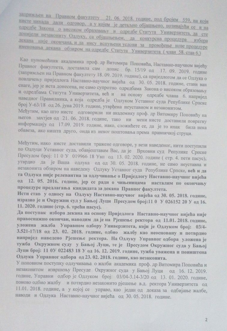 „Jasno je da izbor dekana Pravnog fakulteta po proceduri iz 2016. godine još nije pravnosnažno okončan i da nije mogla da bude provedena nova konkursna procedura za izbor dekana“, navodi se u dokumentu koji je Popovićev advokat dostavio NNV Pravnog fakulteta, UO Univerziteta i rektoru Univerziteta u Banjoj Luci.