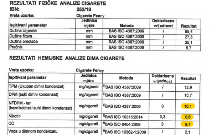 Pokazali su to i rezultati analize koju je uradila laboratorija sertifikovana za analize duvanskih proizvoda „Euro Inspekt“ iz Sarajeva.