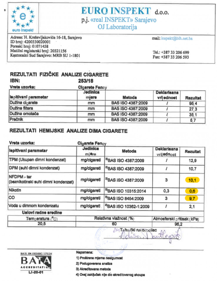 Pokazali su to i rezultati analize koju je uradila laboratorija sertifikovana za analize duvanskih proizvoda „Euro Inspekt“ iz Sarajeva.