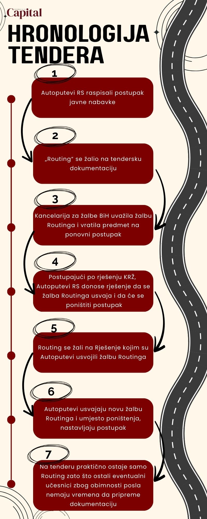 Sve je počelo u aprilu ove godine kada su „Autoputevi RS“ raspisali tender za „nadzor na izgradnji autoputa Vukosavlje-Brčko“ vrijedan 15 miliona KM bez PDV-a i drugi tender za „nadzor na izgradnji autoputa Brčko-Bijeljina“ u vrijednosti od sedam miliona KM, takođe bez PDV-a.