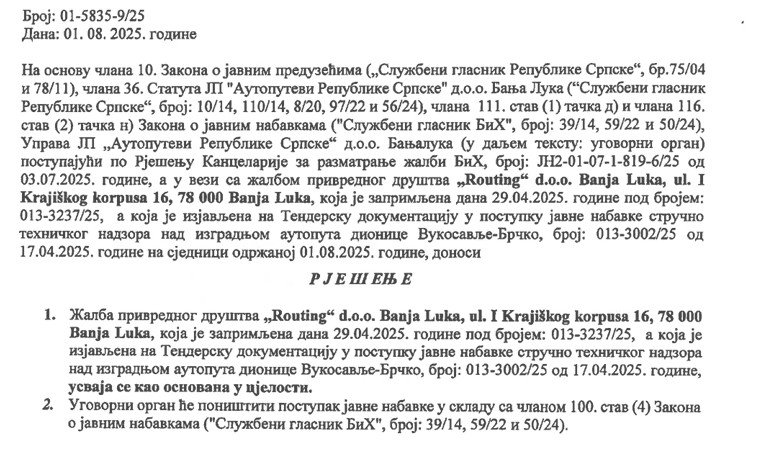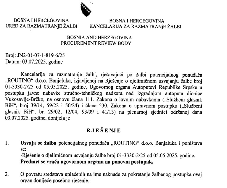 Kancelarija za razmatranje žalbi BiH (KRŽ) prihvatila je sve žalbene navode „Routinga“ i rješenjem od 3. jula vratila predmete „Autoputevima RS“, kao ugovornom organu na ponovni postupak.