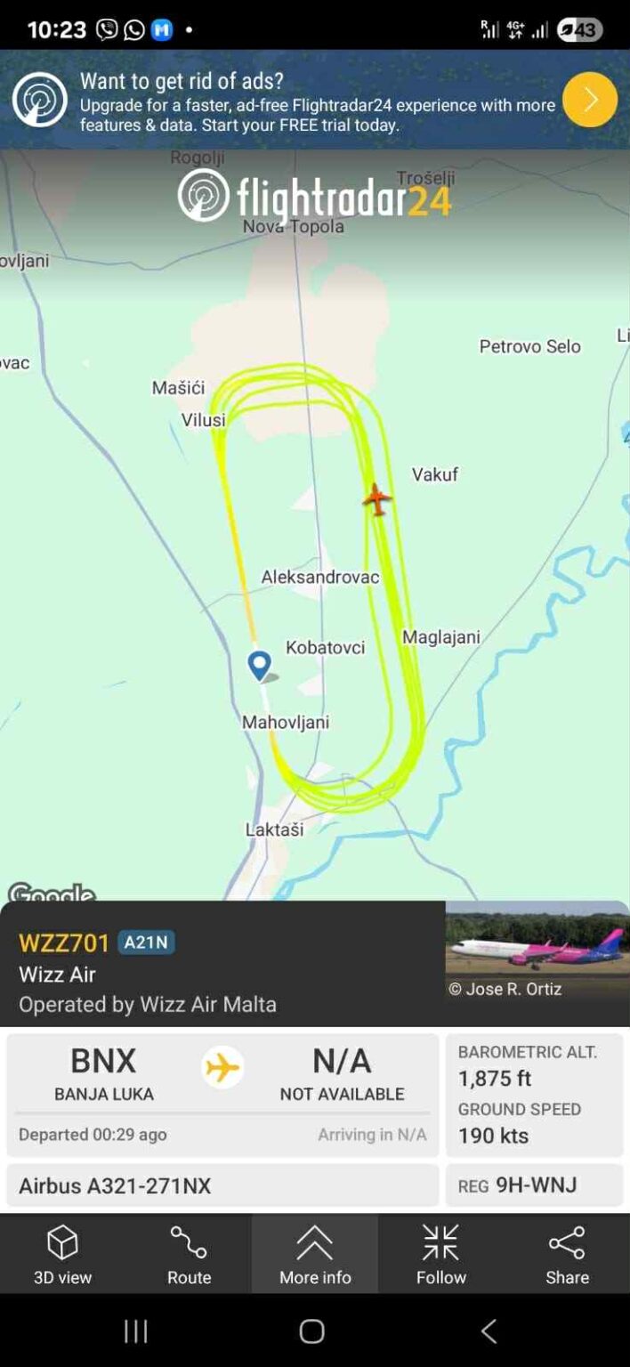 Avion aviokompanije Wizzair izazvao je zabrinutost među građanima nakon što je više puta kružio iznad banjalučkog aerodroma bez slijetanja. Prema riječima očevidaca, avion je napravio najmanje četiri kruga.