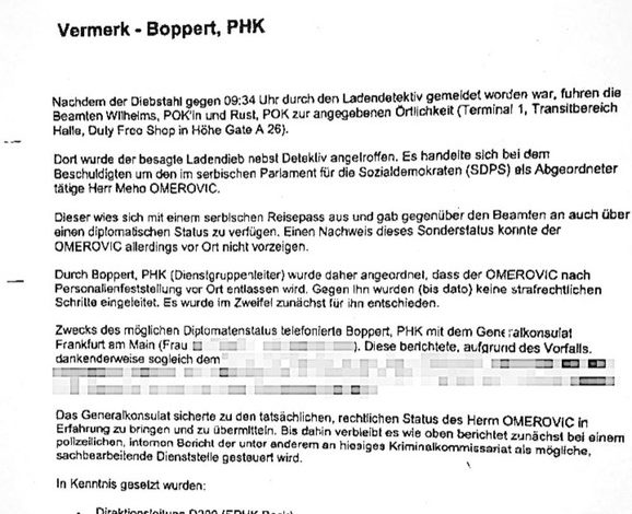 “Policajac ga je priveo jer ga je uhvatio kako iz fri-šopa pokušava da iznese robu koju nije platio. Legitimisao se srpskim pasošem. Poslije molbe službenika srpskog konzulata, načelnik policijske službe na aerodromu naložio je da se Omerović pusti. Uzeti su mu lični podaci, a o slučaju je odmah obavješten konzul Srbije u Frankfurtu”, piše, između ostalog, u izvještaju njemačke policije.