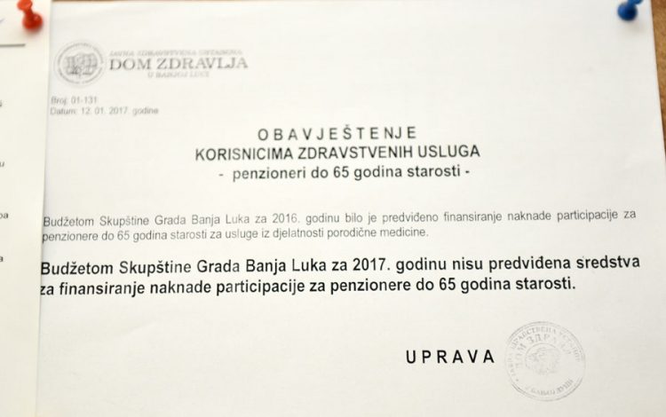 “Budžetom Skupštine grada za 2016. godinu bilo je predviđeno finansiranje naknade participacije za penzionere do 65 godina starosti za usluge iz djelatnosti porodične medicine. Ove godine ta sredstva nisu predviđena”, stoji u hodniku Poliklinike.