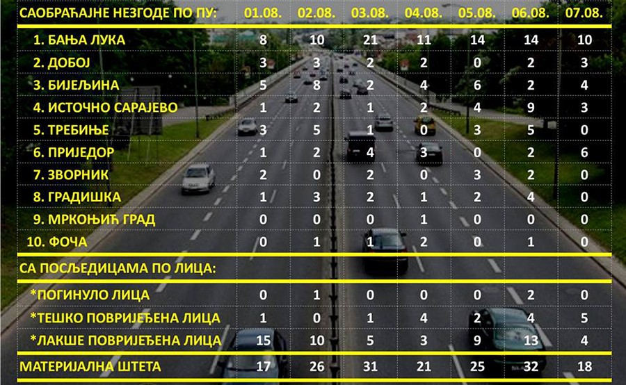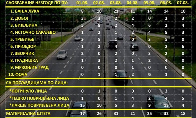 Kako je objavila Agencija za bezbjednost saobraćaja RS na svom fejsbuk profilu, a na osnovu podataka Ministarstva unutrašnjih poslova RS, najviše udesa na banjalučkim putevima u prvih sedam dana ovog mjeseca zabilježeno je 3. avgusta – čak 21.