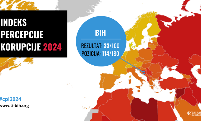 Bosna i Hercegovina doživjela je značajan pad po ovogodišnjem Indeksu percepcije korupcije (Corruption Perception Index) i sa dosad najgorom ocjenom 33, zauzima uz Bjelorusiju drugo najlošije mjesto u Evropi.