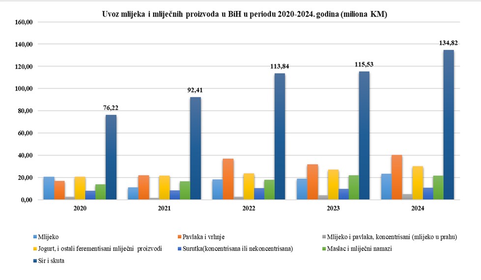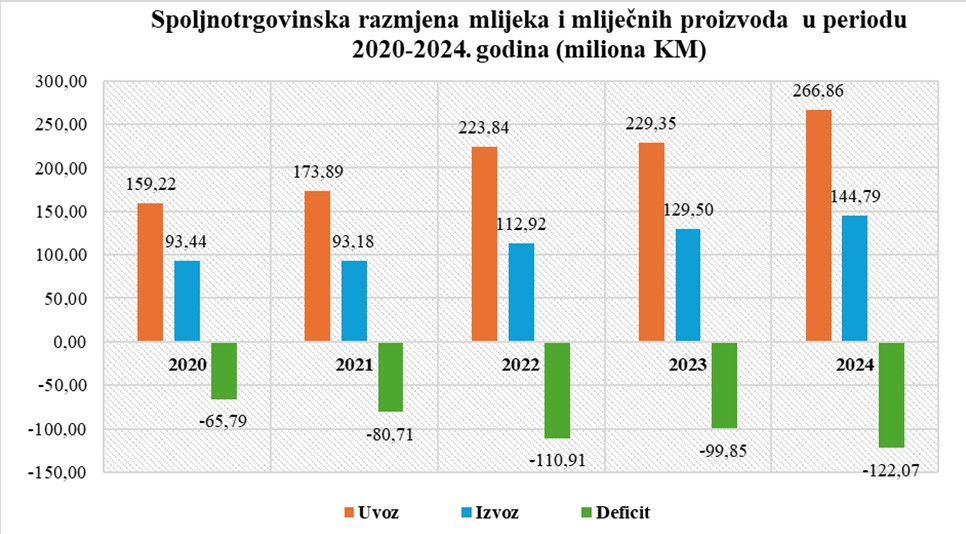 Analiza stanja na tržištu mlijeka i mliječnih proizvoda u BiH pokazuje da BiH u ovoj oblasti ima spoljnotrgovinski deficit od 122 miliona KM.