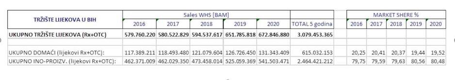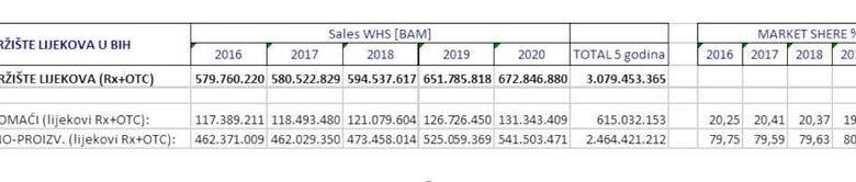 Za posljednjih 5 godina na tržištu Bosne i Hercegovine inostrani proizvođači lijekova su prometovali 2,46 milijardi KM, od čega je oko 80 posto prometa u lijekovima koji se finansiraju na teret obaveznog zdravstvenog osiguranja BiH kroz sve nivoe zdravstvene zaštite, dok je preostalih 20 posto prometa u bezreceptnim lijekovima koje građani sami kupuju.