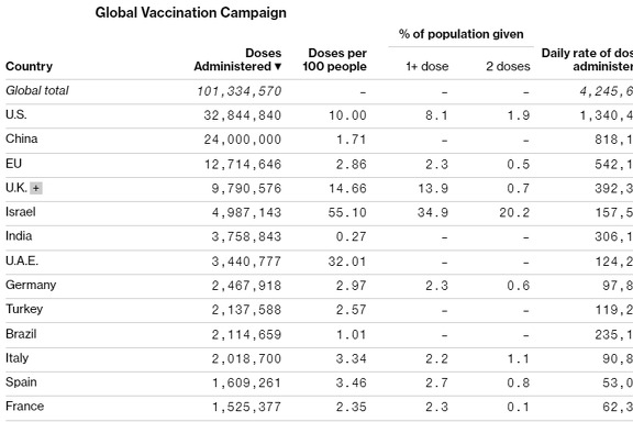 Prema podacima američkog Bloomberga, do danas je dat 101 milion doza vakcina u 64 države. Nešto manji je broj ljudi koji je vakcinisan, jer su neki primili po dvije doze.
