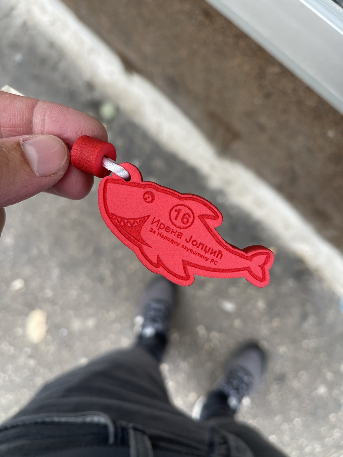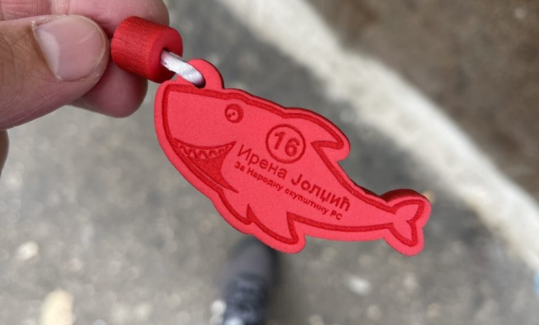 Ona u kampanji dijeli privjesčiće sa crvenom ajkulom. Podsjećanje je to na onaj eksplicitni video snimak iz Hurgade u kojem je ona poručila da je egipatska policija skroz nesposobna, jer nije u stanju da se izbori sa ajkulama na plaži i da bi policija RS i ministar Lukač “tu ajkulu već uhvatio i ispekao na ražnju”.