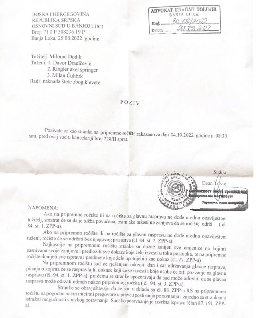 Iako je Dragičević danas dobio poziv iz Osnovnog suda, pripremno ročište je zakazano već za 4.oktobar, odnosno kroz šest dana piše Blink.