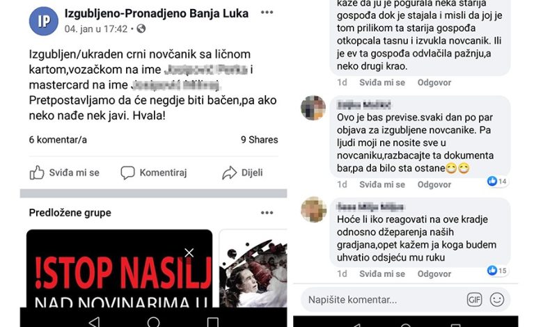 Nestanci novčanika vjerovatno bi od strane oštećenih vlasnika bili pripisani slučajnosti i neopreznosti da nema društvenih mreža i grupa na kojima građani svakodnevno prijavljuju nestale stvari.