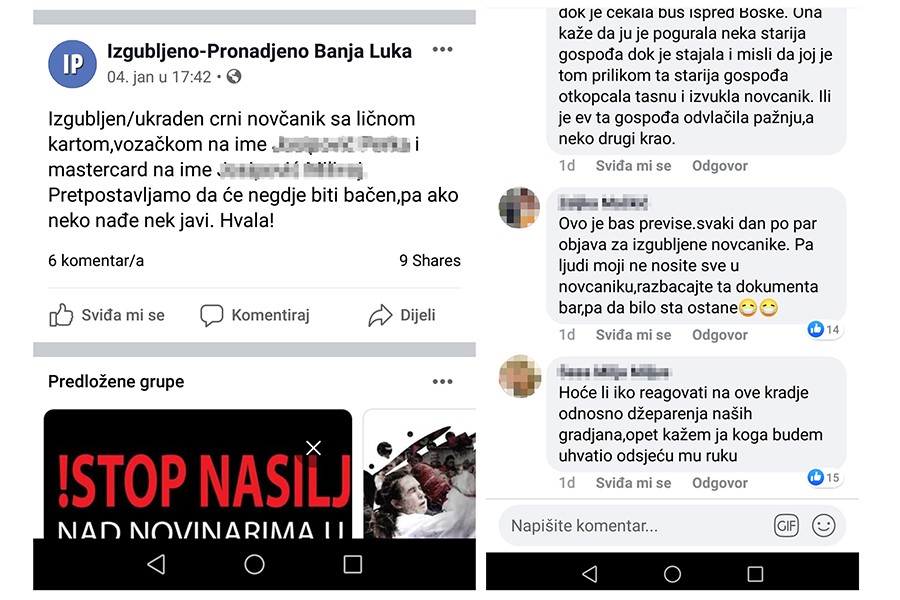 – Danas oko 15. 30 u autobusu šestica izgubljen je moj novčanik sa svim ličnim dokumentima. Izgubljen novčanik sa dokumentima na ime M. R. Izgubljen novčanik i dokumenti na ime J. N. na relaciji Centar – Starčevica. Ako neko nađe neka se javi u kometar. Poštovanje, izgubljen novčanik sa dokumentima i novcem na ime M. G. Ako neko ima informaciju molim da javi na 066 xxx. Izgubljen novčanik sa svim dokumentima na ime S. M. Moli se pronalazač da se jav i- samo su neke od objava koje su ogorčeni građani podelili na društvenim mrežama.