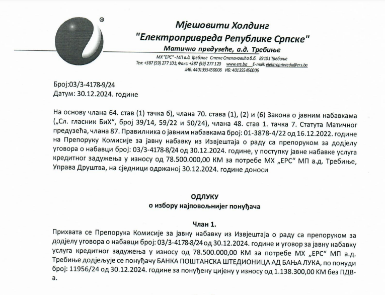 Dan kasnije, odnosno 31. decembra Petrović donosi odluku o izboru „Banke poštanska štedionica“ kao najpovoljnijeg ponuđača za kredit od 78,5 miliona maraka.