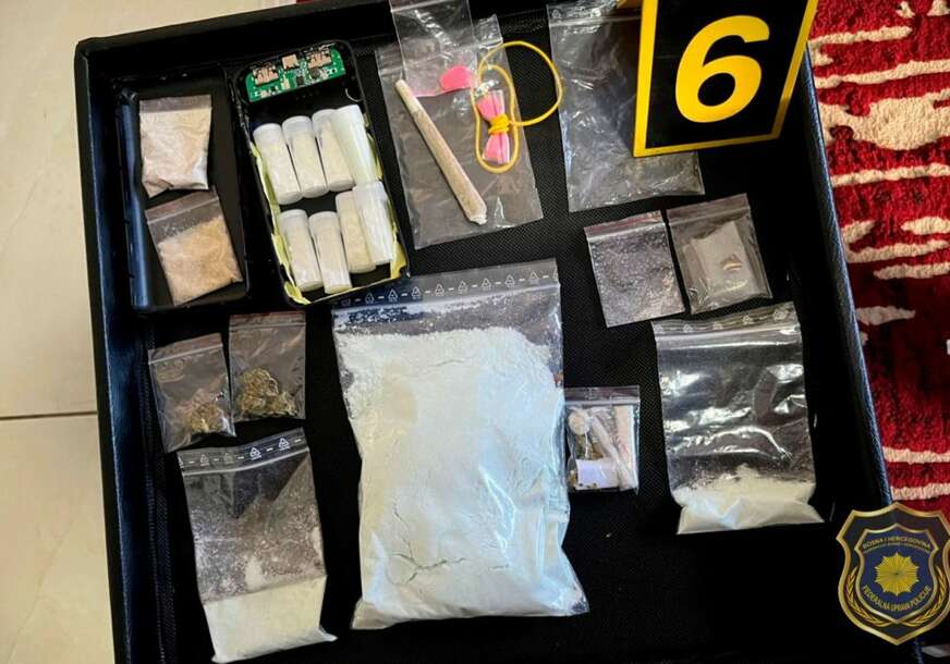 "Pronađeno je oko 300 grama materije, koja svojim izgledom asocira na opojnu drogu amfetamin, zatim oko 20 grama materije koja svojim izledom asocira na opojnu drogu kokain, određena količina materije koja svojim izgledom asocira na heroin, LSD i metamfetamin (Crystal meth), te pištolj i veća količina municije", navodi se u saopćenju FUP-a.