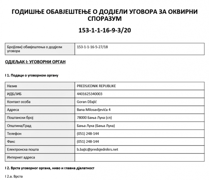 U godišnjem obavještenju o dodjeli ugovora za nabavku pogonskog goriva kompanije Nestro Petrol, objavljenom 13. januara ove godine za instituciju predsjednik Republike Srpske, navedeno je da je jednogodišnji period (15. juli 2018–14. juli 2019. godine) za ove namjene izdvojeno 182.364 KM.