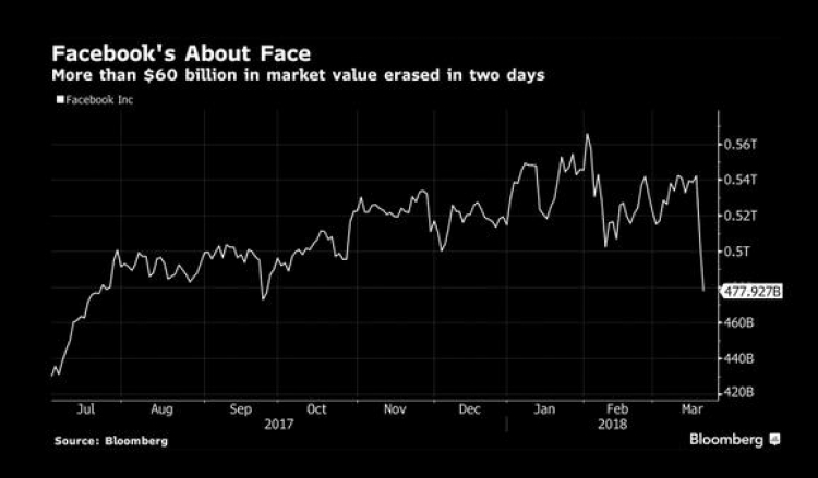 Kompanija ”Facebook” izgubila je 60 milijardi dolara tržišne vrijednosti tokom posljednja dva dana od kada su počele da padaju akcije na berzi kao posljedica afere ”Kembridž analitika”.