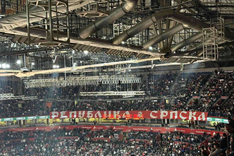 Svi navijači u hali su uoči početka susreta podigli kartone na kojima je bio grb vojske Republike Srpske.