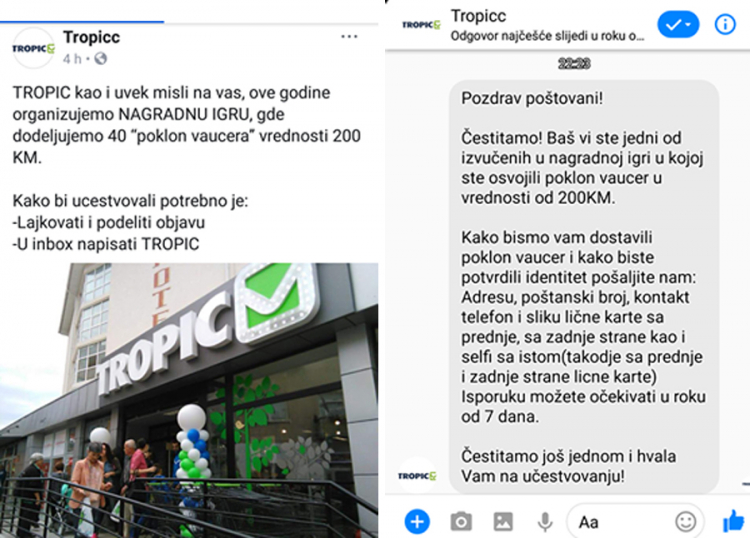 Na društvenoj mreži Facebook u zadnjih nekoliko dana pojavila se lažna nagradna igra kojom se pojedini građani obavještavaju kako su osvojili nagradni vaučer trgovačkog lanca "Tropic" u vrijednosti od 200KM. Od "dobitnika" se traže fotografije ličnih dokumenata i njih samih kako bi navodnu nagradu preuzeli.