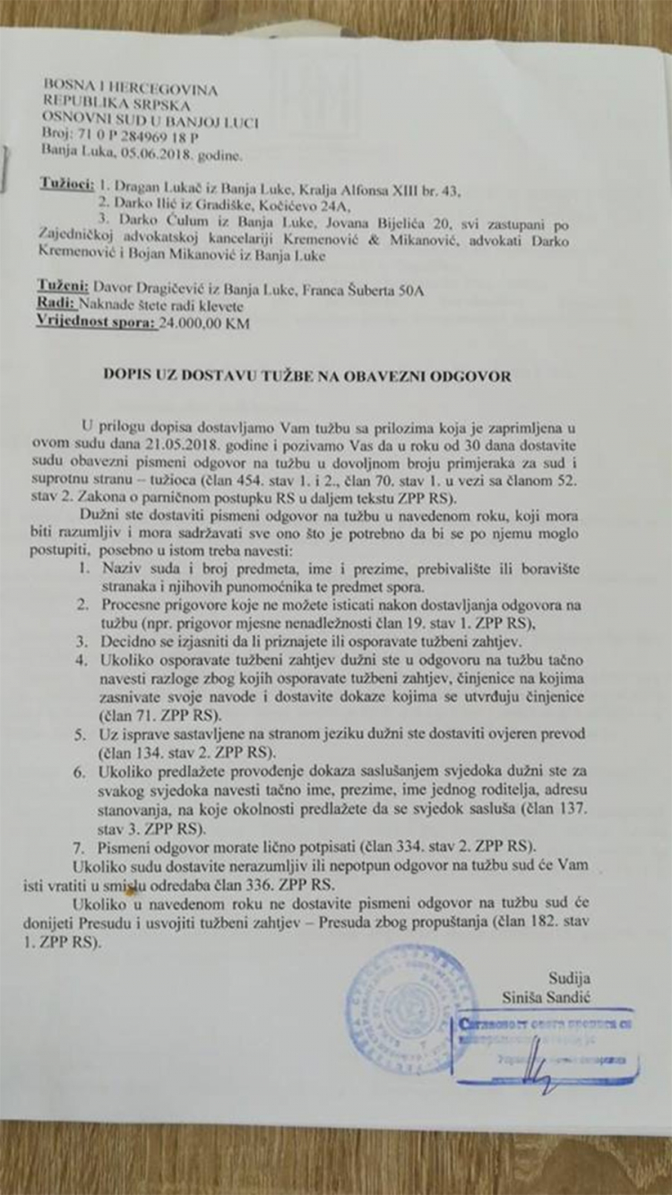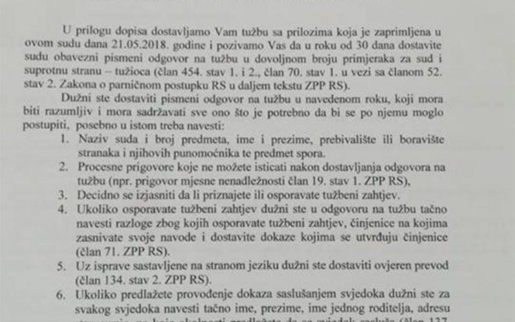 U dopisu iz suda navedeno je da se Dragičević izjasni da li prihvata ovaj tužbeni zahtjev, a ako odbija – da napiše odgovor na tužbu.