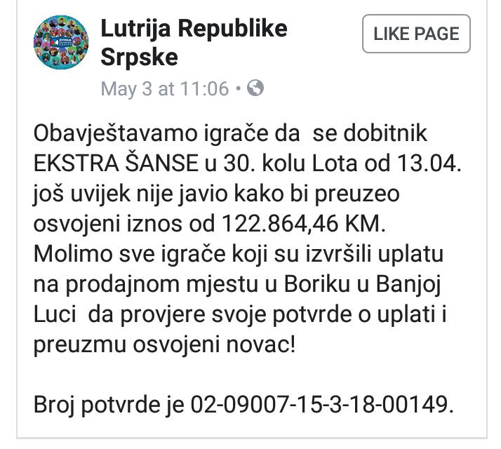Iz Lutrije apeluju na sve igrače, koji su na navedem mjestu kupili svoje listiće, da provjere kombinacije jer su možda upravo oni bogatiji za iznos o kojem sanjaju mnogo stanovnici Banjaluke.
