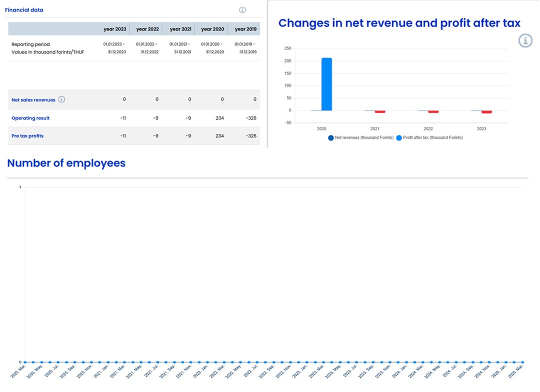 Po dostupnim podacima ova firma je u 2023. godini zabilježila gubitak od 11 hiljada forinti ili 27 evra i ima više obaveza nego imovine, odnosno vrlo nisku sposobnost za kratkoročno izmirenje dugova. Za sve prikazane godine nije imala prodaju, ni poslovnu aktivnost.