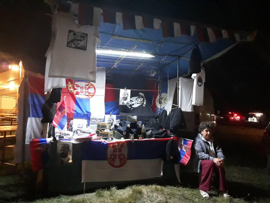 Postavljeni su i štandovi sa “rodoljubivim” suvenirima, majice sa likovima Čiča Draže, ruskog predsjednika Vladimira Putina, folk pjevača Baje Malog Knindže.