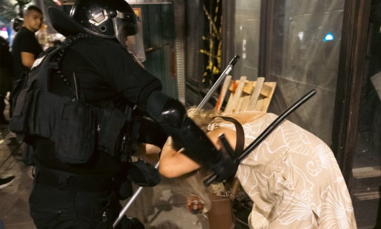 Na fotografiji se vidi trenutak kada je ženska osoba upotrijebila metalnu šipku prema pripadnicima Žandarmerije, a policijski službenici su koristili sredstva prisile u skladu sa zakonskim ovlašćenjima radi odbijanja napada.