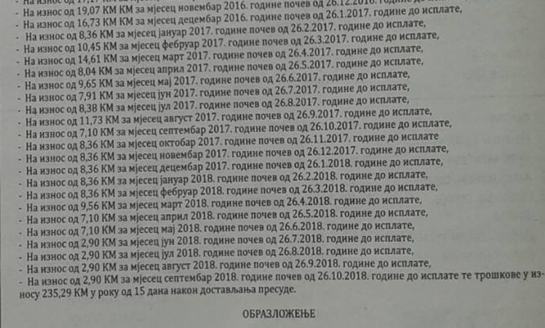 U objavljenoj presudi navedena su dugovanja za svaki mjesec, pa tako ovaj građanin ima dugovanja i po tek 2,90 KM mjesečno.