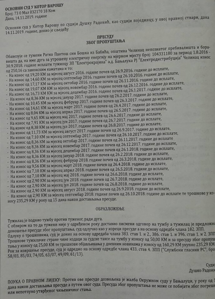 Tako je u štampi Osnovni sud u Kotor Varošu objavio presudu zbog propuštanja, a kojom se Ratko Pantoš iz Čelinca obavezuje da na ime duga za utrošenu struju od 1. avgusta 2016. do 30. septembra 2018. godine plati dug “Elektrokrajini” Banjaluka.