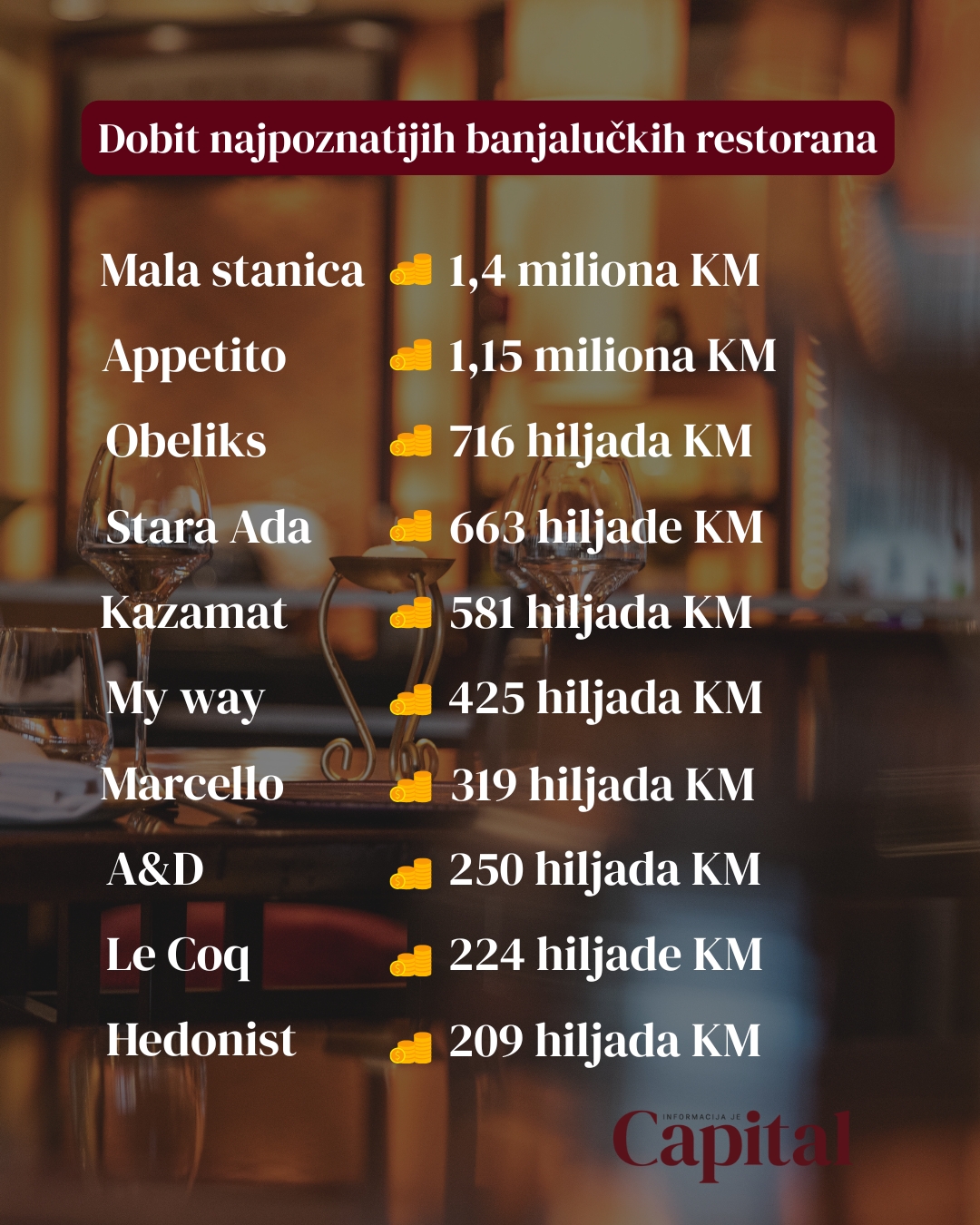 Na vrhu liste kao i ranijih godina je „Mala stanica“. Ovaj restoran koji posluje na više lokacija prošle godine je ostvario prihod od oko 7,7 miliona KM. To je nešto manje nego godinu ranije, ali je zato dobit umanjena sa 1,7 miliona u 2023. godini na manje od 1,4 miliona maraka prošle godine.