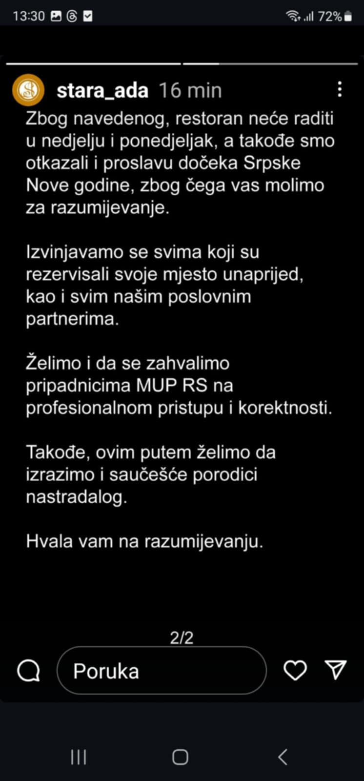 – Mi zaposleni u restoranu “Stara Ada” ni na koji način nismo povezani sa ovim nemilim događajem – ističu oni, te dodaju da restoran neće raditi u nedjelju i ponedjeljak, a otkazan je i doček Pravoslavne nove godine.
