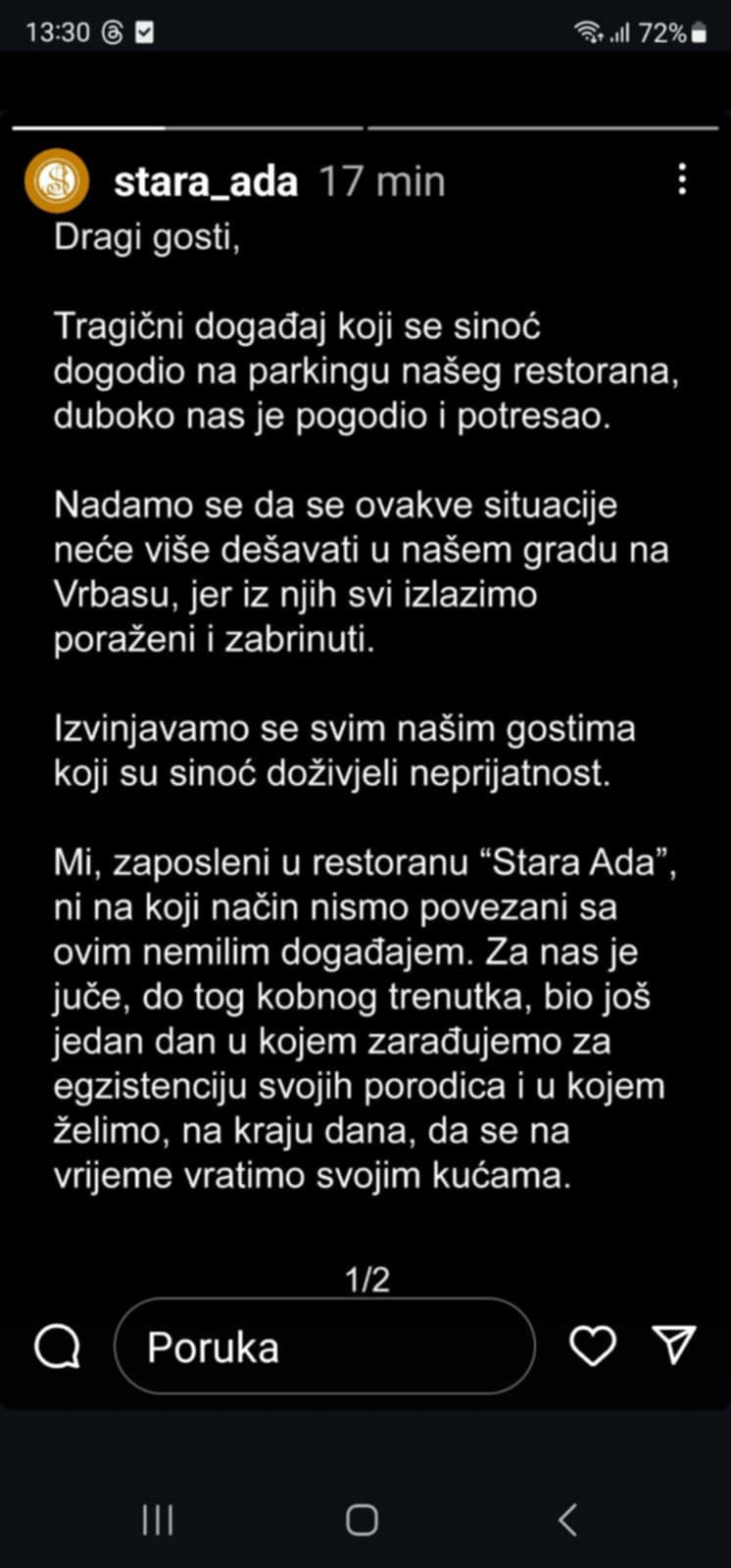 Tragični događaj koji se sinoć dogodio na parkingu našeg restorana duboko nas je pogodio i potresao, saopštili su iz restorana “Stara Ada” na društvenim mrežama.