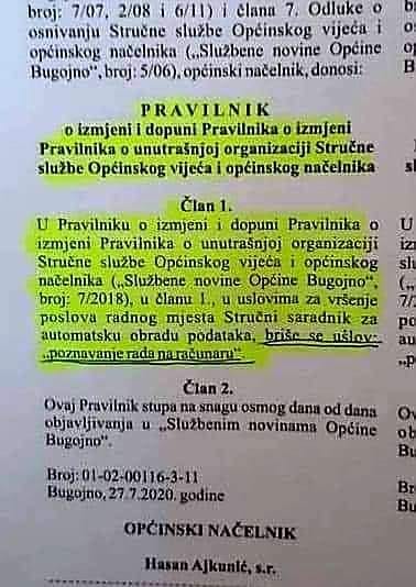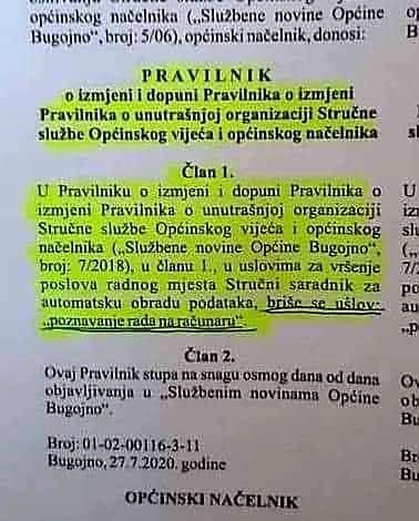 U Službenim novinama opštine Bugojno od 27. jula se tako navodi da je opštinski načelnik donio odluku o izmjeni Pravilnika o unutršnjoj organizaciji stručne službe opštinskog načelnika i Vijeća opštine, a izmjena glasi: ” u članu 1. u uslovima za vršnje poslova radnog mjesta stručni saradnik za automatsku obradu podataka briše se uslov “paznavanje rada na računaru”.