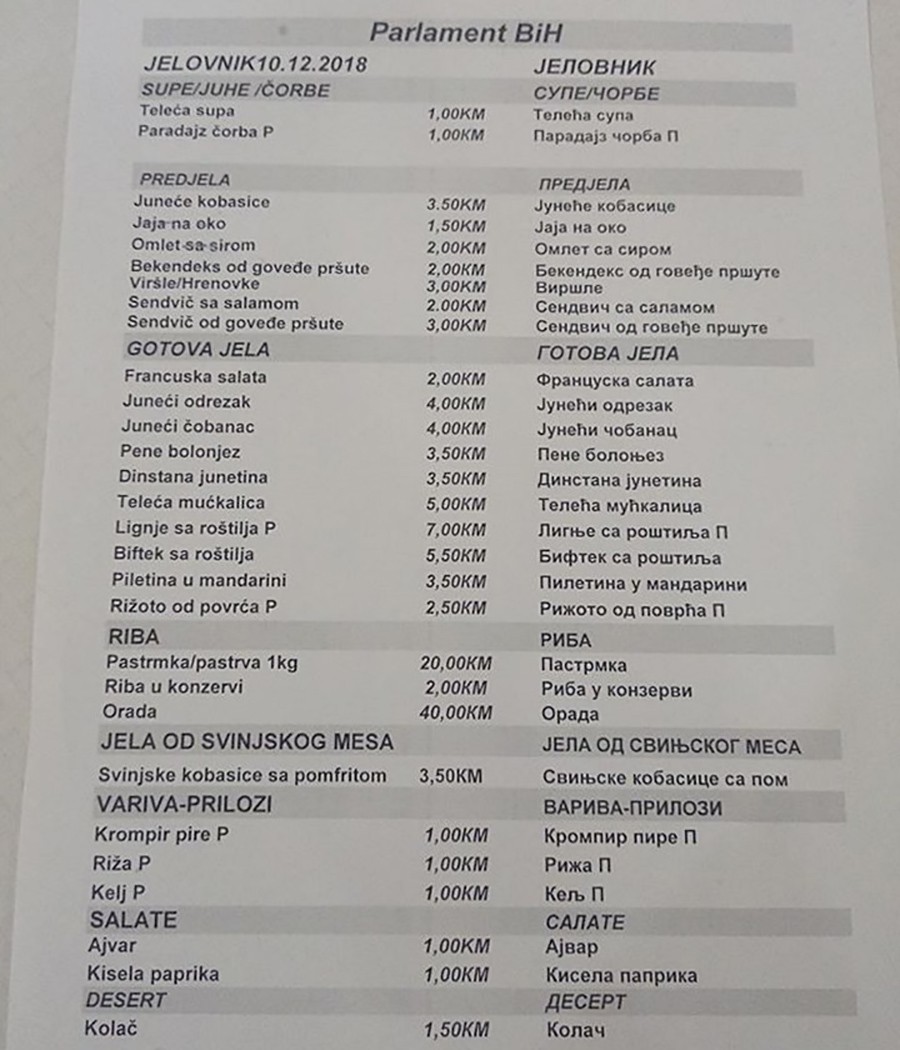 Ovo su cijene po kojima imaju pravo da jedu svi oni kojima je radno mjesto Parlamentarna skupština BiH – 57 poslanika, kao i njihovo osoblje.