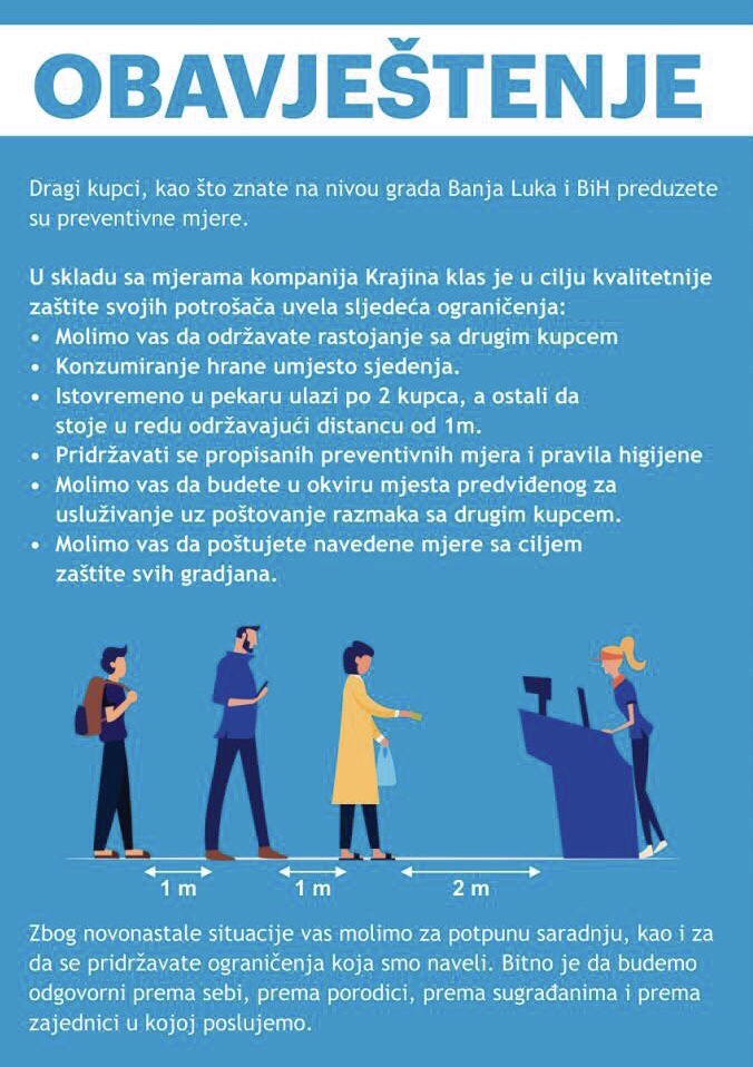 “U skladu sa Naredbom o regulisanju rada trgovinskih i drugih objekata na teritoriji Grada Banjaluka, obavještavamo vas da subjekti koji obavljaju djelatnost proizvodnje hljeba, peciva, svježe tjestenine i kolača (isključivo u pogledu prodaje svoih proizvoda) u periodu od 7,00 do 18,00 časova vrše uslugu na uobičajen način. U periodu od 18,00 do 22,00 časa mogu vršiti uslugu putem šalterske prodaje, prodaju na vratima ili usluživanjem unutar objekta, na način da u poslovnom objektu ne smiju istovremeno boraviti više od dva kupca. Način usluživanja ste dužni jasno istaknuti na ulazu u poslovni objekat i istoga se pridržavati”, stoji u obavještenju koje je od Komunalne policije dobila “Krajina klas”.