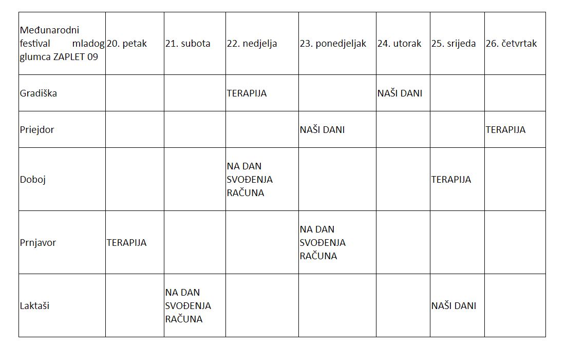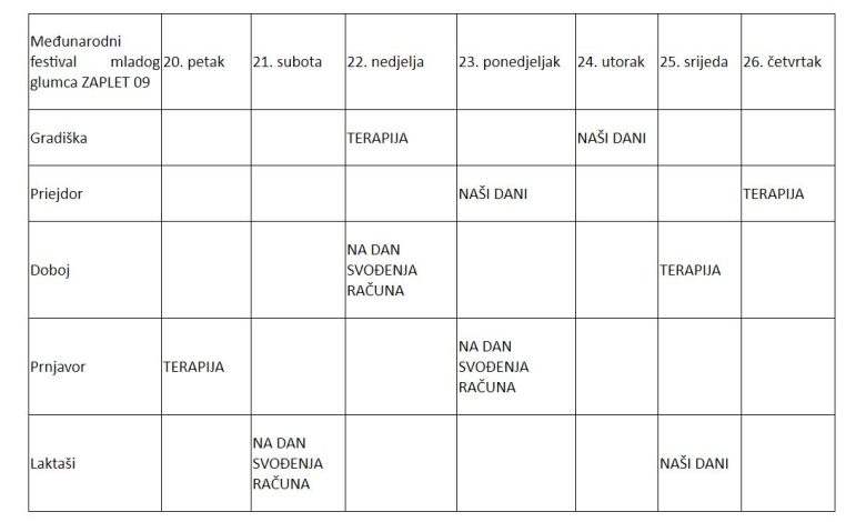 1. Program „Zaplet na točkovima“ u sklopu kojeg će biti izvedeno deset predstava u Prijedoru, Gradišci, Laktašima, Prnjavoru i Doboju po sljedećem rasporedu: