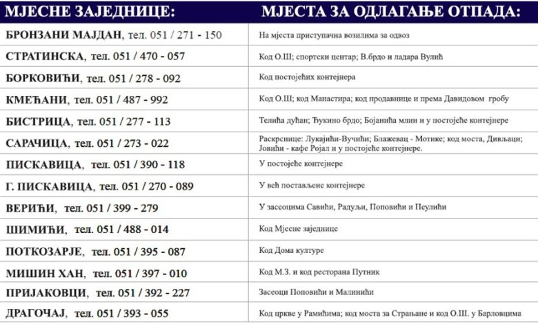 U narednih deset dana krupni otpad mogu iznijeti stanovnici Kočićevog Vijenca, Lauša, Pobrđa, Bulevara, Paprikovca, Petrićevca, Borika, Nove Varoši, Rosulja, Lazareva, Motika, Drakulića, Šargovca, Zalužana i Kuljana, kao i seoskih naselja: Stratinska, Bronzani Majdan, Kmećani, Borkovići, Gornja Piskavica, Bistrica, Saračica, Verići, Šimići, Potkozarje, Mišin Han, Dragočaj i Prijakovci, na predviđenim lokacijama.