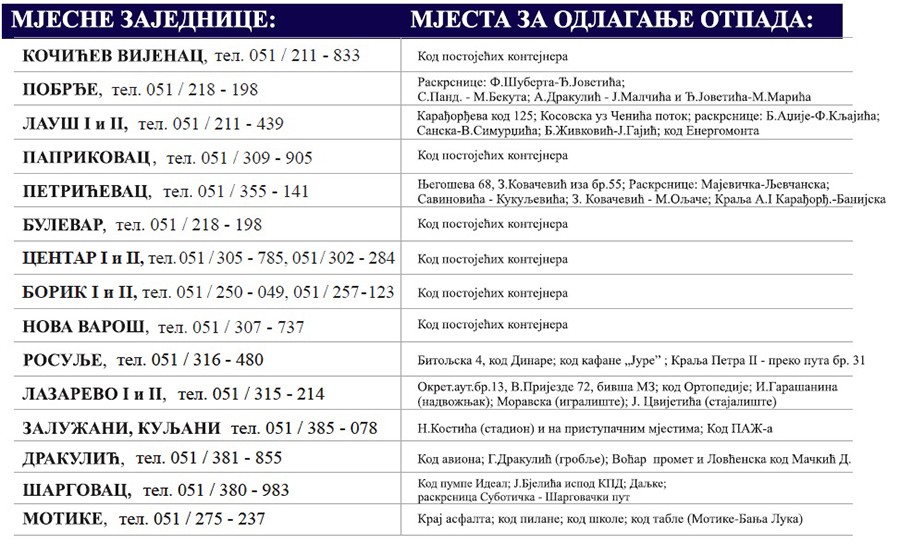 U narednih deset dana krupni otpad mogu iznijeti stanovnici Kočićevog Vijenca, Lauša, Pobrđa, Bulevara, Paprikovca, Petrićevca, Borika, Nove Varoši, Rosulja, Lazareva, Motika, Drakulića, Šargovca, Zalužana i Kuljana, kao i seoskih naselja: Stratinska, Bronzani Majdan, Kmećani, Borkovići, Gornja Piskavica, Bistrica, Saračica, Verići, Šimići, Potkozarje, Mišin Han, Dragočaj i Prijakovci, na predviđenim lokacijama.