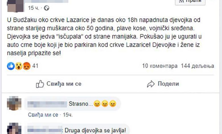 – Prišao joj je stariji muškarac, oko 50 godina i plave kose. Djevojka se jedva uspjela izvući pobjeći. Pokušao ju je ugurati u automobil crne boje, koji je bio parkiran kod crkve Lazarice – navedeno je u ovom statusu.