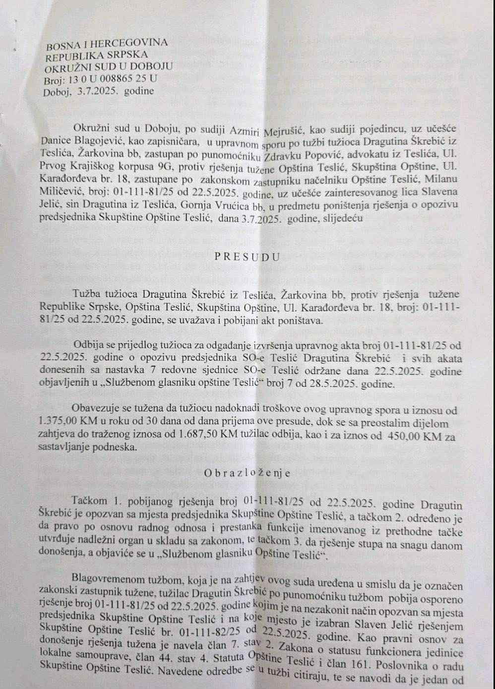 U presudi Okružnog suda u Doboju, koja je donesena juče, navodi se da su Škrebić i Јotanović u nastavku sedme sjednice Skupštine opštine održane 22. maja opozvani na nezakonit način, kada su na njihovo mjesto imenovani Slaven Јelić za predsjednika i Mehmeda Dubravac za potpredsjednika.