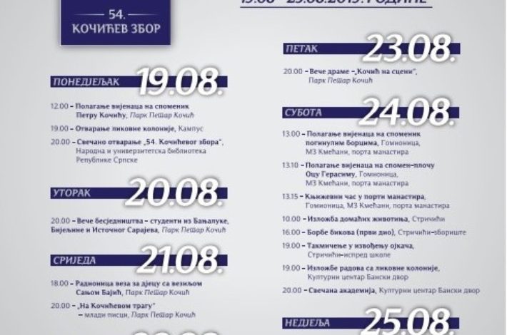 Ovogodišnja manifestacija posvećena narodnom tribunu Petru Kočiću, 54. „Kočićev zbor“ počinje u ponedjeljak 19. avgusta i traje do 25. avgusta.