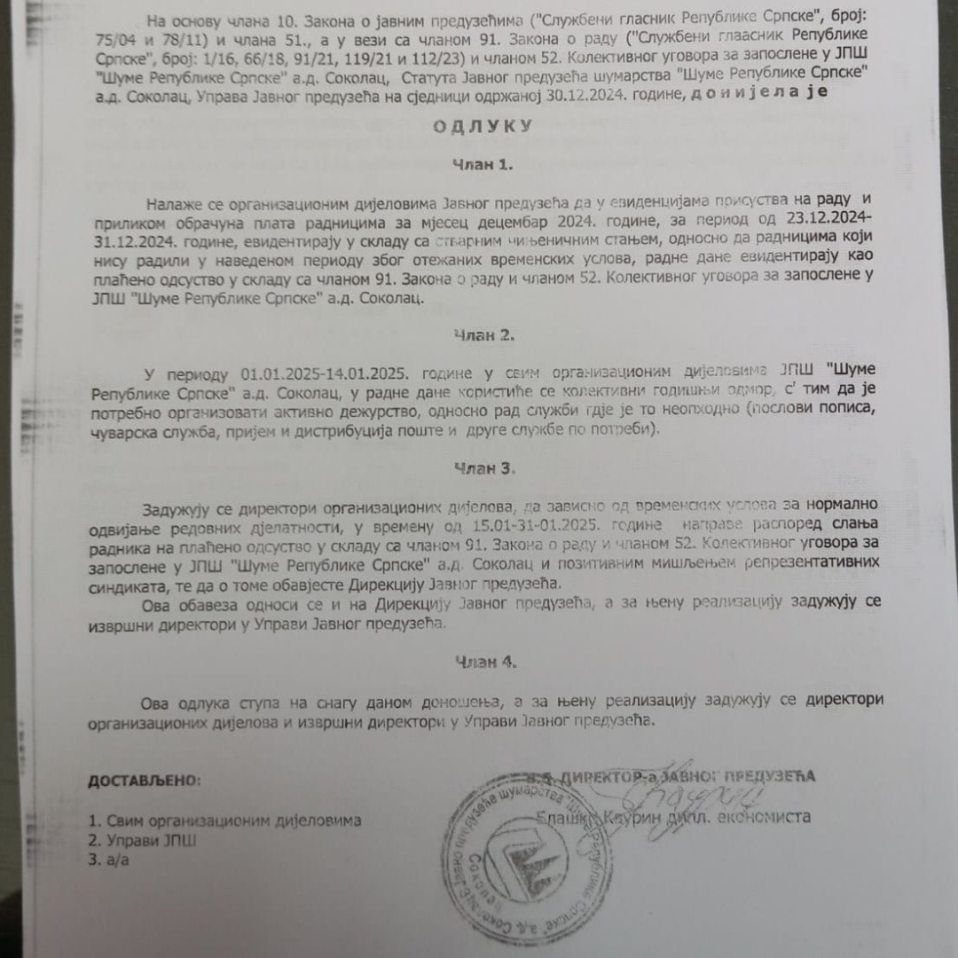 Zadužuju se direktori organizacionih dijelova, kaže se dalje, da zavisno od vremenskih uslova za normalno odvijanje redovnih djelatnosti od 15. do 31. januara naprave raspored slanja radnika na plaćeno odsustvo u skladu sa pozitivnim mišljenjem reprezentativnog sindikata, te članom 91. Zakona o radu i članom 52. Kolektivnog ugovora za zaposlene u „Šumama“.
