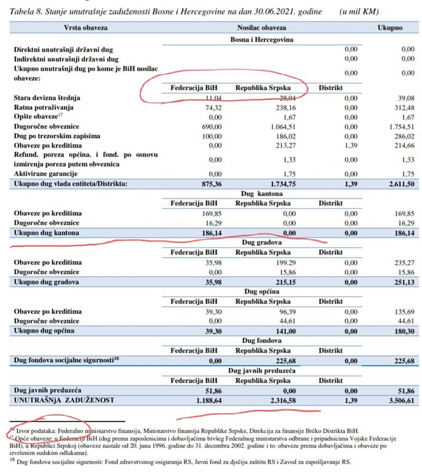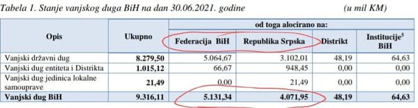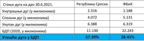 Naglašava da je javni ukupan dug Republike Srpske, zaključno sa 30. junom ove godine, iznosi 6 milijardi i 388 miliona dok javni ukupan dug FBiH iznosi 6 milijardi i 319 miliona.