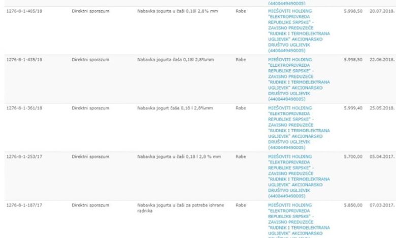 Dodaju da je pravilnik Agencije za javne nabavke BiH propisuje da se godišnje za istu stvar može potrošiti samo 6.000 KM putem direktnog sporazuma, ali je RITE Ugljevik samo na nabavku “jogurta u čaši” potrošio oko 24.000 KM prošle godine, navode oni.