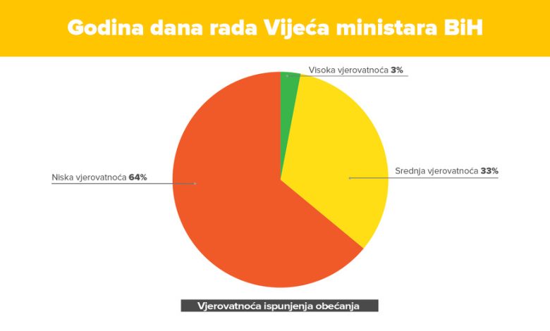 "Uzimajući u obzir pomenute rezultate, može se zaključiti da je Savjet ministara BiH za godinu uradilo veoma malo na ispunjavanju datih obećanja partija koje su ga i formirale, pa tako tek 3% datih obećanja ima veliku vjerovatnoću da će biti ispunjeno do kraja mandata 2022. godine. Najveći broj obećanja, njih 64%, ima malu vjerovatnoću da će biti ispunjeno do kraja mandata", istakli su.