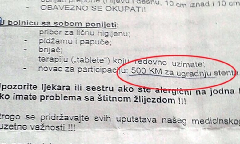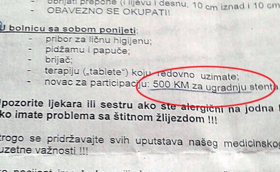 Tako pacijentima kojima je zakazana ova intervencija šalju obavještenje u kojem, u okviru stavki šta im sve od dokumentacije treba za prijem na odjeljenje, između ostalog stoji da u bolnicu sa sobom donesu i “novac za participaciju: 500 KM za ugradnju stenta”!